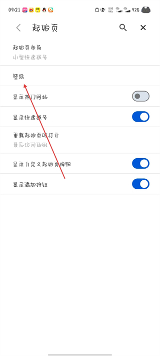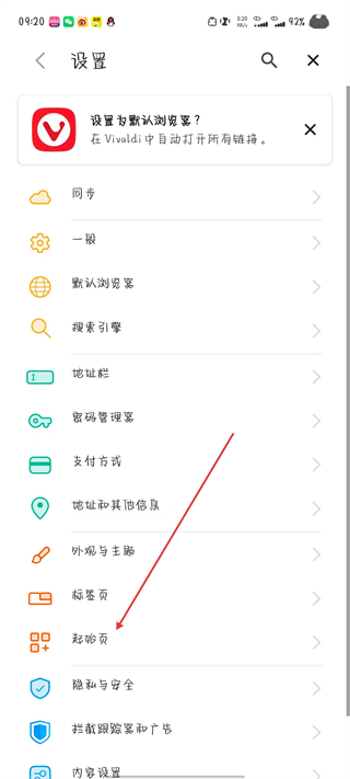 3、进入设置页面后,找到并点击起始页选项。