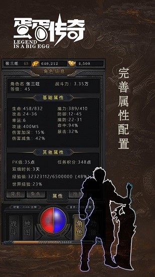 战法道三职业都非常强势,并且有各自独特的技能,都能带来不错的游戏乐趣。元宝、钻石、金币等货币大家都可以通过参与活动或者刷怪爆得,所以不需要氪金也能成为土豪。蛋蛋传游戏继承传奇游戏经典玩法,有战法道三大职业供玩家选择,选择职业创建角色开启传奇之旅,游戏融入文字挂机等元素,玩法更多更有特色。