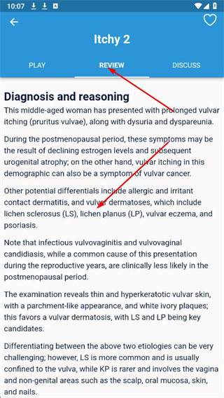 3、点击REVIEW,可查看Diagnosis and reasoning部分的诊断和推理过程,学习病例分析思路。
