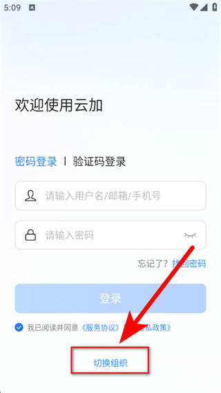 1、打开云加APP登录页面,我们需要点击切换组织的按钮。