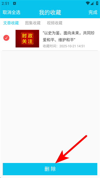 4、勾选目标收藏内容后,点击底部删除,即可删除选中的收藏内容。