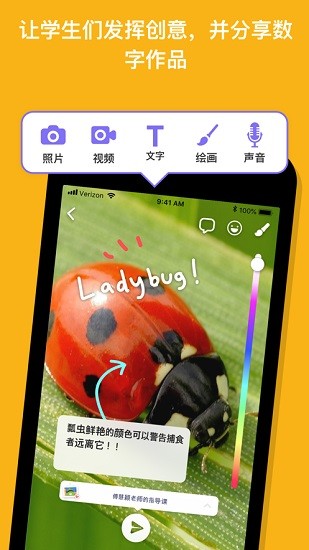 学生可以通过在他们自己的资料中添加照片和视频来展示和分享他们的学习