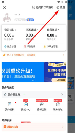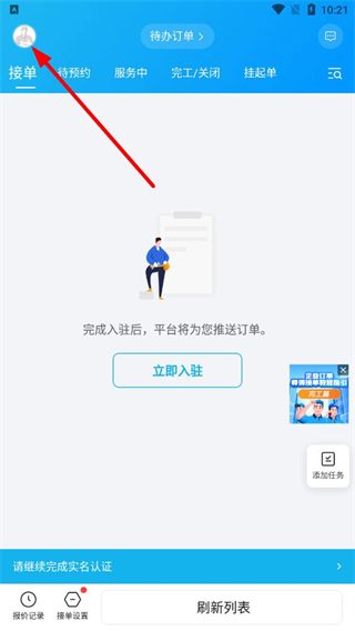 1、打开万师傅师傅版APP,点击底部我的选项,进入个人中心页面,找到接单设置功能并点击。