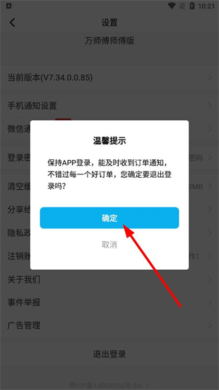 4、在弹出的温馨提示弹窗中,点击确定按钮,即可完成万师傅app的退出登录操作。