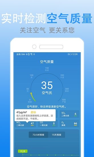 ②空气质量监测:认真呵护您的健康,提供未来48小时及15天空气质量预报;更新空气质量、PM2.5等指数预报。