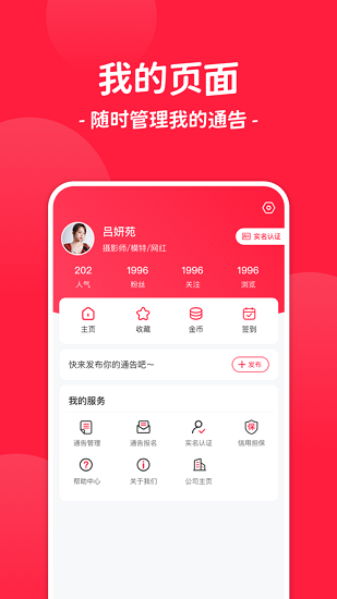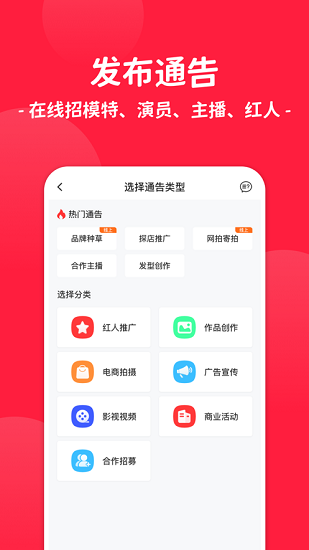 1、自由发布 等待合作:用户自己可以在平台上轻松的发布各种不同类型的通告来找到符合要求的艺人,互相之间建立合作关系,轻松的进行商务往来。