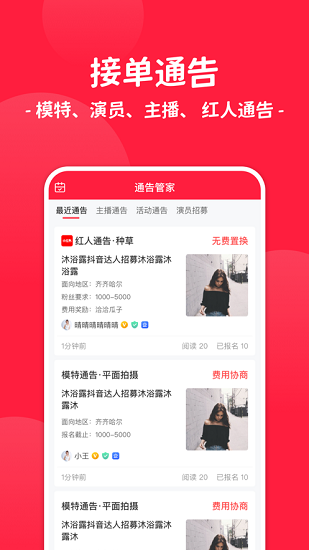 2、丰富平台 艺人多样:通告管家app通过独特的渠道模式构建,在软件入驻了非常丰富的各种优质艺人类型,无论是网络红人还是模特演员都有。
