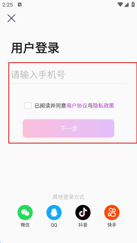 4、在用户登录界面输入手机号,勾选已阅读并同意用户协议与隐私政策,点击下一步,完成登录操作。