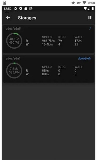 磁盘:每个分区对应的挂载点,以及容量和当前读写速度等