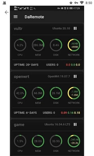 DaRemote 通过ssh隧道和Linux自带的工具来查询系统信息和运行状态,并在您的手机上用直观的图列展示出来。