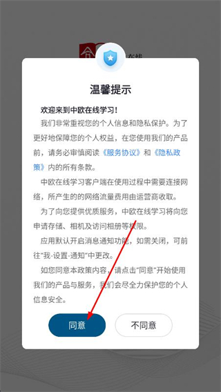 1、打开中欧在线,在弹出的窗口中,点击同意按钮。