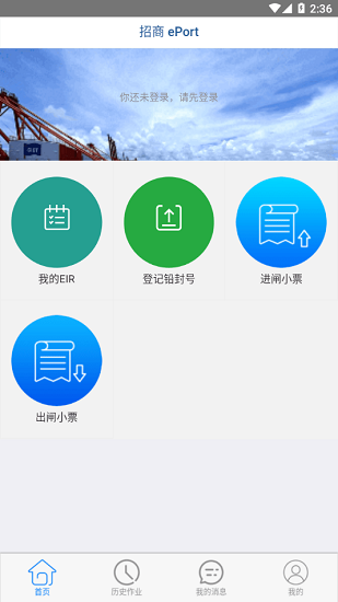 招商ePort是招商局国际信息技术有限公司打造的一个移动端客户服务系统软件,招商ePort具备我的EIR、登记铅封号、历史作业、我的消息等功能模块。