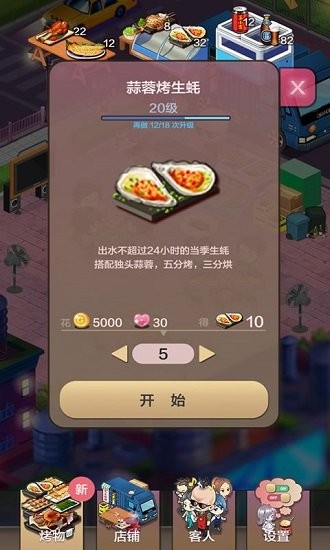 3.从而轻松打造出更多美味佳肴。提高烧烤技能,完成不同的烧烤任务,获得更多游戏奖励。提高收入,招聘员工。