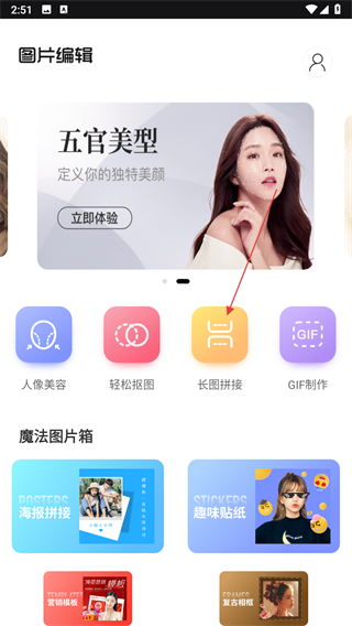 1、打开图片编辑合成器,在主界面找到长图拼接功能并点击。