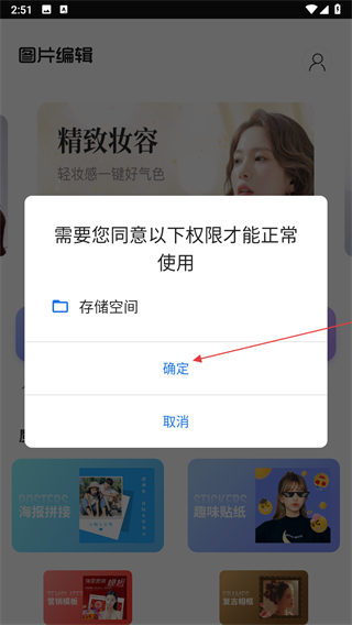 2、弹出权限申请窗口,点击确定授予存储空间权限,以便后续读取和保存图片。