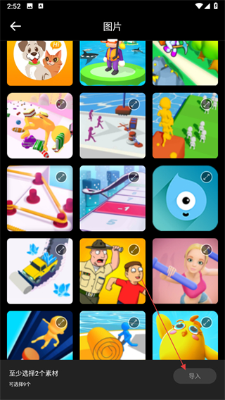 3、进入图片选择页面后,从手机相册中挑选至少2张需要拼接的图片,选好后点击导入。