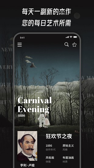 每天都能得到关于美丽又经典,现代亦当代的杰作的灵感,并且能读到关于它们的故事。每日都能在每日艺术受到启发。