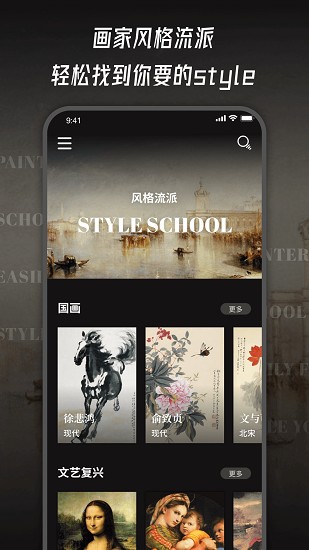 风格流派,多种多样,用户可以通过软件构建的强大搜索引擎模式查看各式各样的分裂,包括绘画时代以及风格还有艺术家名称以及类别。