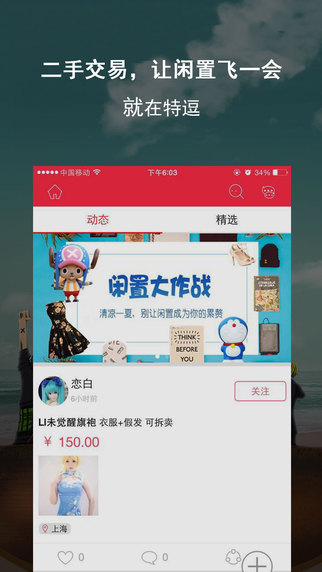 特逗潮流Go新增闲置交易模块,特逗交易社区是最前卫的移动端闲置物品交易平台。免费为你提供原创、动漫闲置交易平台!在这里,你可以免费发布信息售卖你闲置的原创或动漫产品。在这里,你还可以免费发布求购信息来求购任何你想要的原创、动漫产品。