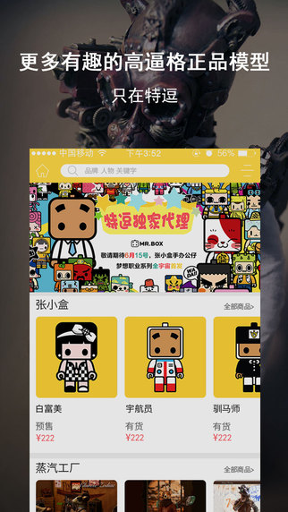 线上聚集全球知名动漫品牌,展现上千种正版动漫周边产品:ALTER阿尔塔、万代、FUNKO、GoodSmile等众多品牌;更有蒸汽工厂等蒸汽朋克风手办模型。