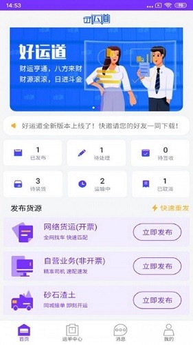 好运道物流企业端,是帮助企业打造的一款专业的货运软件,在应用中,软件能提供在线客服,运单的跟踪,货源的发布,以及最后的订单管理和数据统计功能,帮助企业提高效率,软件功能强大,内容丰富,版块分类明确,应用的使用范围广,有需要的用户千万不要错过,快来下载体验吧!