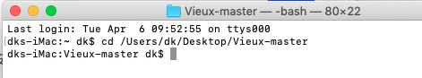 1,终端输入: cd /Users/dk/Desktop/Vieux-master(终端输入cd +空格,把vieux文件夹拖进去)