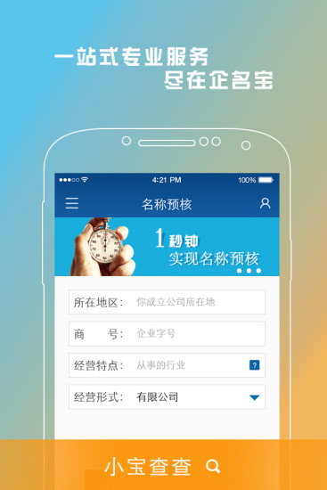 一秒钟名称预核:企名宝使您迅速知道自己名称能不能使用、是否违法和是否与其他企业重名,最快一秒钟就可以得出核名结果,堪称"核名神器"。