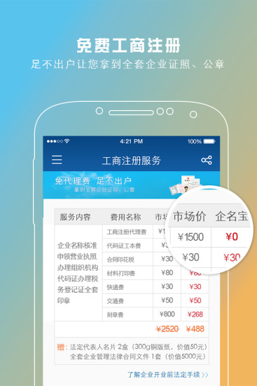 免代理费,一站式全程为您办理所有证、照、章,让您足不出户就能轻松当老板,再也不用来回跑工商局看人的脸色、处理签不完的文件了。