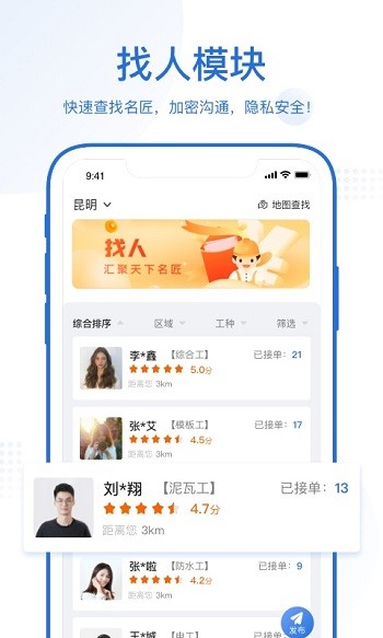 快速查找名匠,加密线上沟通,保护隐私安全。
