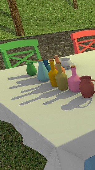 用锤子把场景三中桌子上罩着胡萝卜的玻璃罩打碎,得到胡萝卜??,把胡萝卜??放到场景四中的空盘子里,场景五中的兔子??会过来吃