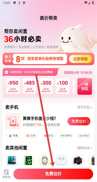 3、进入到高价帮卖页面,可以点击下方免费估价按钮,进行估价商品进行售卖。