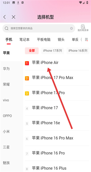 4、进入机型选择页面,可以点击要出手的机型,进行估价售卖。