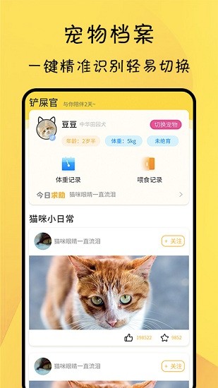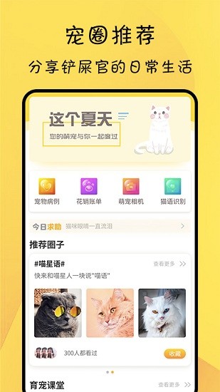 猫友舍是面向广大铲屎官们打造的综合服务软件,铲屎官的日常,涵盖了铲屎官的日常生活中常用的工具,“分享主子的美好生活”,你可以通过文字、图文等形式记录猫咪日常动态、体重、喂食、病例、花销账单等。