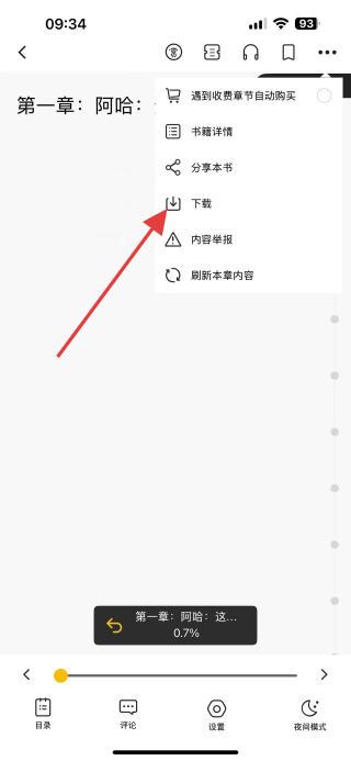 3、在阅读界面点击屏幕中间位置,唤出功能菜单,点击右上角三点图标,在弹出菜单中选择下载即可下载小说章节。