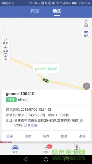 4.轨迹回放:支持回放180天内行车轨迹,回放过程中可显示车辆当时的车速、方向、停留时间等。