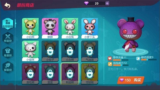 同时还有可以丢泡泡的小手套,还有各种不同的武器还有坐骑,从而来帮助玩家不断的取胜;