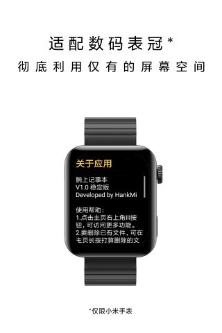 HankMi便签全面升级为腕上记事本,为手表定制的TXT文档阅读器,支持独立新建、编辑、删除本地TXT文档。本次大升级更带来了UI的统一深度定制、精心调教的过度动画、简单易懂的文件传输教程、更快速的启动速度等新特性。