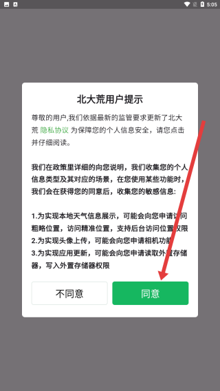1、面对北大荒用户提示弹窗,可以通过点击同意按钮,接受隐私协议,进入后续登录界面。