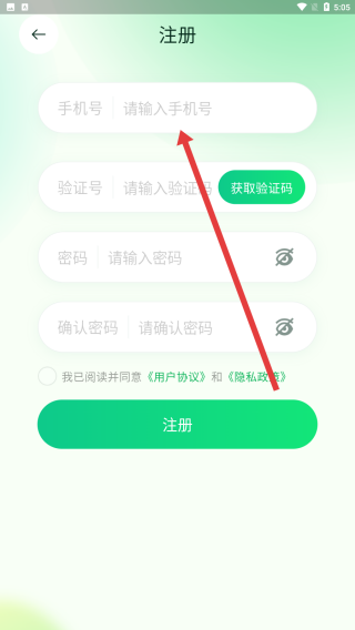 3、进入到注册页面后,按照箭头指示在手机号输入框填写手机号码,为注册账号第一步操作。
