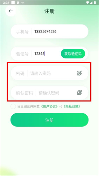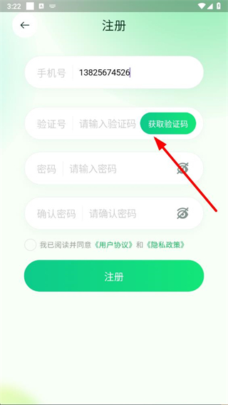 2、在注册页面输入手机号,点击获取验证码按钮,输入验证码。