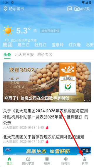 在手机上打开北大荒农服app后,点击【信息采集】。