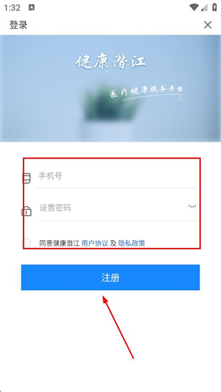 3、输入手机号,设置密码,勾选协议,点击注册。