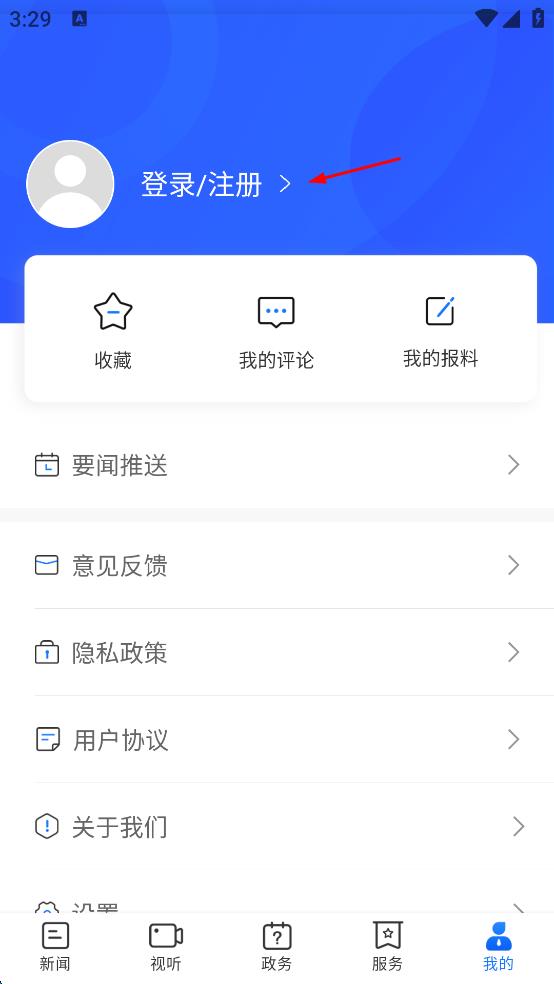 2、在“我的”页面,点击“登录/注册”按钮,进入登录页面。