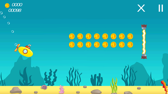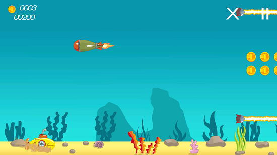 潜艇大作战是一款十分有意思的休闲趣味游戏,你控制你的潜艇进行上下奔腾,拾取金币,非常的有意思,挑战各种困难的任务,不要踩到鱼雷,购买升级装备,让你跑的更远!