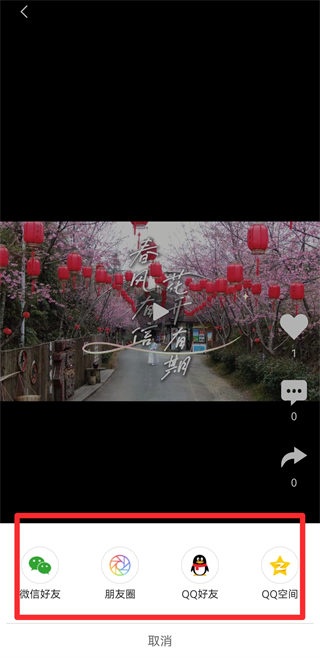 3、在视频播放操作页面,点击分享按钮,弹出分享渠道选择界面。