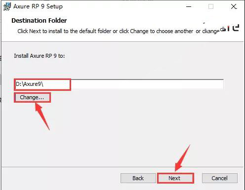 4、点击【Change...】更改软件的安装路径,建议安装在除C盘之外的其它磁盘,可以在D盘或其它磁盘新建一个【Axure9】文件夹,然后点击【Next】。