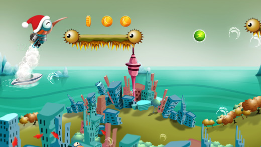4.游戏中点击屏幕来让尽可能的收集更多的金币!飞行中还可以收集绿色能源,收集到足够能源可以进入超级模式!具体能源在界面下方显示!