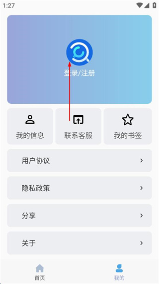 2、在个人页面点击登录/注册,进入登录选择页面。