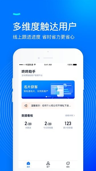 咚咚助手app非常实用的办公方软件通过团结用户可以进行获客的管理,实时的数据统计便捷的收集移动的管理让你可以更好的管理客户资料,简洁的手机移动办公软件,快来下载试试吧!