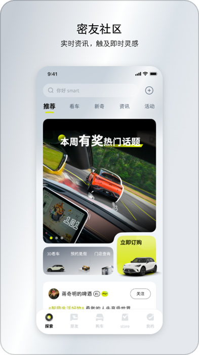 在smart汽车APP上可以获取最新最COOL的smart潮流资讯,参与smart丰富的社区活动,加入你感兴趣的smart社群和所有smart的朋友们探索充满潮趣与前卫的全新未来。